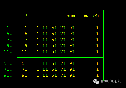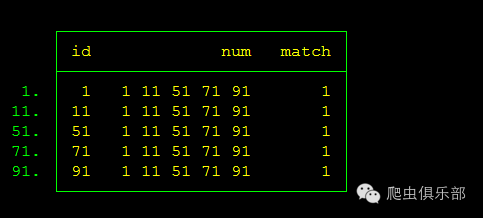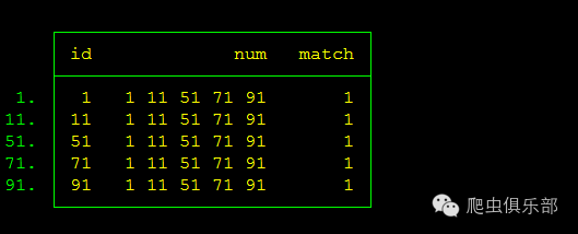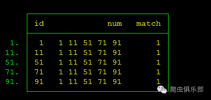 但是根据如上的方法,你会发现,当id=1,id=11,id=51,id=71,id=91时,match值都为1,因为在1、11、51、71、91中都出现了数字1,但是我们想要得到的是,只当id=1时,match值为1。