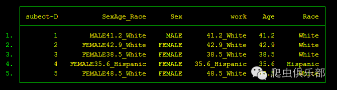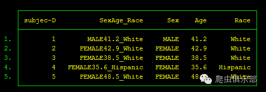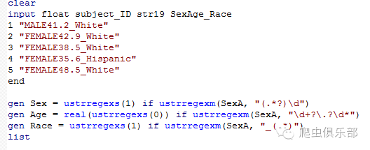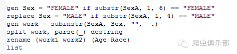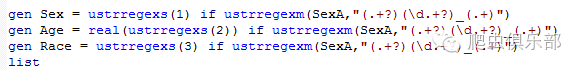 首先创建一个子表达式,其中”.”符号表示可以匹配任意字符,用*?表示懒惰匹配模式,\d匹配数字,也就是把最左端的数字前面所有的内容,提取出来并赋给变量Sex。同理,提取变量Age时,\d匹配数字,+表示把前面的字符或子表达式匹配几次或多次,同样使用懒惰模式,匹配到最近一个小数点,点后面的?表示匹配一次或零次,小数点可能不存在,所以后面的数字也是匹配任意次,提取出来之后用real函数把Age变成数值型变量。最后是Race变量,"_(.*)"表示匹配并提取_后面的所有内容。这样,我们就把数据变成我们想要的形式了。
