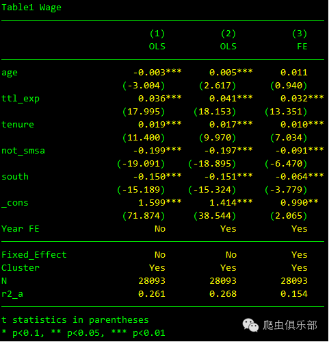 输出的表格很精美,然而仍有不足:1)没有显示是否控制年份;2)没有显示cluster;3)没有显示是否控制个体效应(Fixed Effect)。