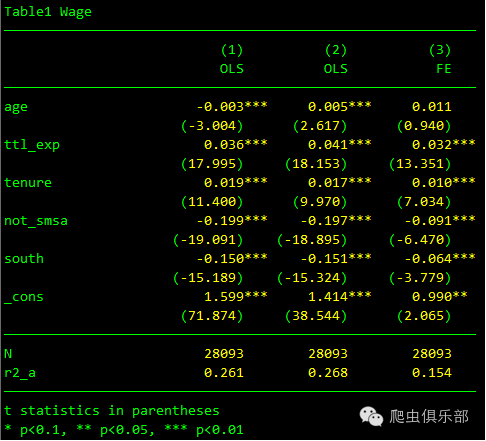 varwidth(20) title("Table1 Wage") mtitle("OLS" "OLS" "FE")