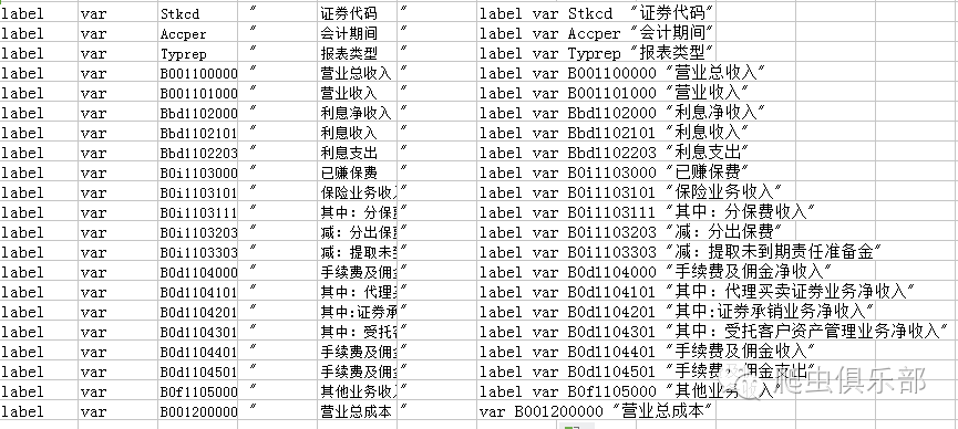 最后,是非常简单但却有点费事的一步——定义标签。原来的数据变量名不规律,所以为了以后使用数据时比较方便,需要定义标签。这里又要用到师兄教的独门秘诀了。由于数据里的变量数量太多,一个一个地去定义标签太慢,为了得到label语句,我们要借助一下excel表格。