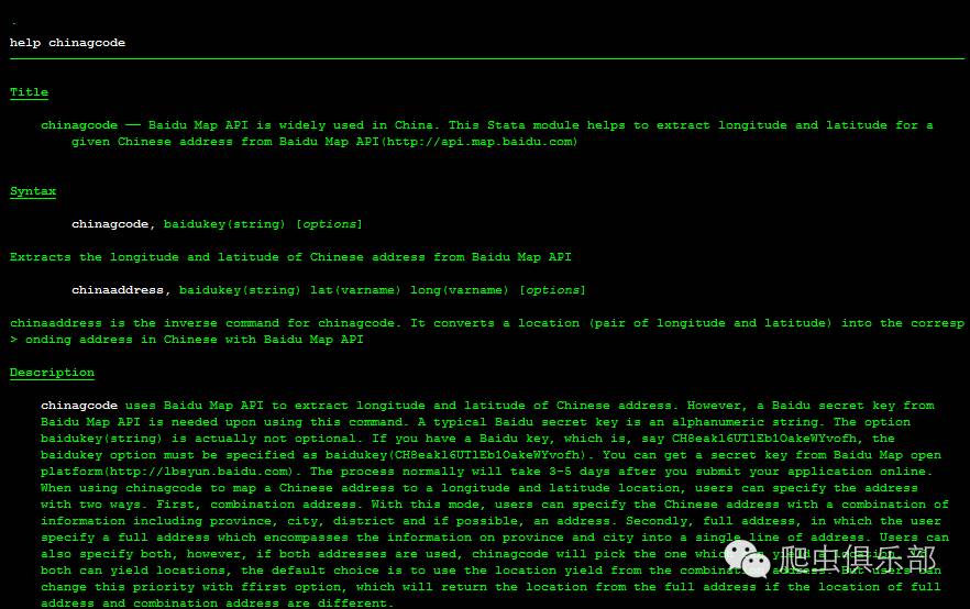 在我们上一个公众号数据处理援助中心,笔者曾经写过一个推文,介绍了如何从中文地址提取经纬度。主要方法是将William Matsuoka个人主页上的一个把字符转化成网站链接中百分比编码的程序改成percentencode命令,用中文地址构造新的链接,抓取经纬度数据。但是这个方法操作起来十分麻烦。为了方便大家使用中文地址经纬度数据进行研究,爬虫俱乐部在这个周末给大家送上一份大礼——最新发布的chinagcode命令。这个命令由李春涛教授带领爬虫俱乐部成员开发完成,可以通过百度地图API将中文地址转化成对应的经纬度数据,同时发布的还有chinaaddress命令。在今天我们先来介绍chinagcode命令。