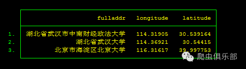 这个时候第二个观测值提取的经纬度就是完整地址湖北省武汉市南湖大道中南财经政法大学的经纬度了。