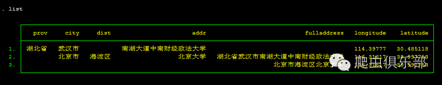 由 于两种定义地址的方式之间微小的差别会得出不同的结果,因此在这个命令中,当你同时定义了两种格式的地址,默认情况下是先从省市区地址的组合中提取经纬 度,当这个组合的地址提取不到经纬度时,会换成完整地址来提取。如果我们加入了一个选项ffirst,当你定义了这个选项,则会先从完整地址中提取经纬 度,提取不到时会换成省市区地址的组合。在我们写的help文件中,有一个例子,在同一条观测值中,根据省市区地址定位的是北京市海淀区北京大学,而根据完整地址定位的是湖北省武汉市南湖大道中南财经政法大学。当然现实中不可能两种定义的方式出现这么大的差别,但这个例子可以很好地帮助我们理解默认情况下和定义了ffirst这个选项的情况下提取方式的不同。我们来看一下这个例子。首先是默认情况: