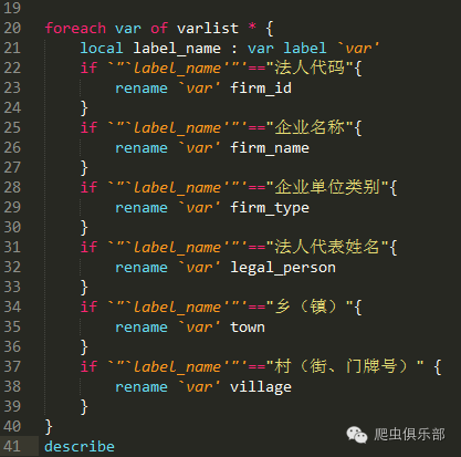 最外层是针对数据集中的每一个变量的一个循环,通过 foreach 实现,其中varlist *使用了通配符,*表示任意字符,这里的含义就是var这个local会依次取数据集中所有的变量。进入循环后,首先是通过local命令获取当前变量的标签信息,并存放在局部宏(local)label_name中:
