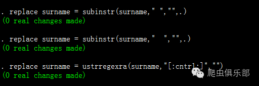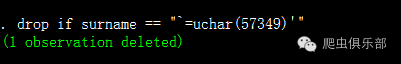 这篇推文同样来自于湖南大学的美女苏老师的问题。苏老师希望能将字符型变量surname为缺失的观测值全部删掉,但却出现了许多“钉子户”,总是无法剔除干净。笔者将数据用unicode命令转码后,导入Stata14,按照surname变量进行排序后,看到最后一条观测值的surname变量是缺失的。这就很奇怪了,因为Stata14对字符型变量按照unicode编码顺序进行排序,无论是缺失、半角空格、全角空格还是各种控制字符,排序后都应该是在汉字之前。事实也证明无论是替换掉空格还是用正则表达式替换掉控制字符,都起不到任何效果。