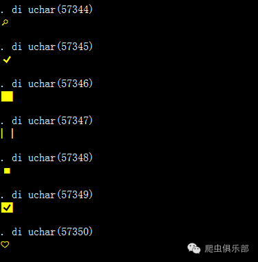 这就是说,这个奇葩字符对应的utf8的十六进制编码是EE 80 85,如果转化成unicode16进制编码,就是E005。而unicode的16进制编码中E000-F8FF范围的6400个字符属于自行使用区域(Private Use Zone)这么一个奇葩范围。将16进制的编码转化为10进制的编码,我们可以通过uchar函数来看看这些奇葩的字符究竟是什么。