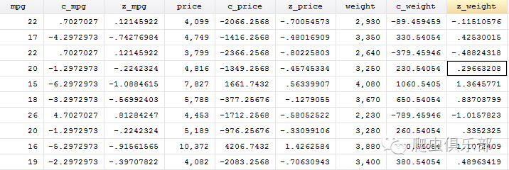 . center mpg price weight, prefix(z_) standardize // 其与单纯中心化的区别