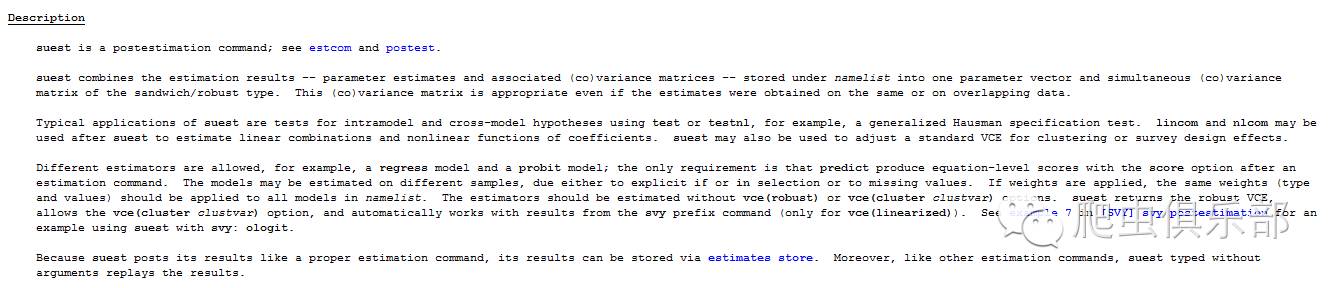 首先,help suest,看看命令的具体作用如下(在这也借此机会提醒stata的使用者help功能很强大,一般的命令如何操作,先help自行学习,实在不明白时再提问,既有助于相互交流、共同学习,还利于提高自学能力及答疑效率):