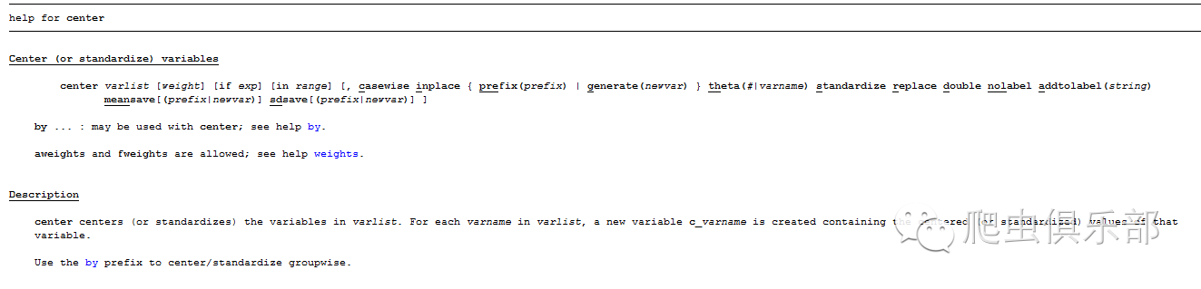 . center mpg price weight //自动生成前缀带c_var的新变量。