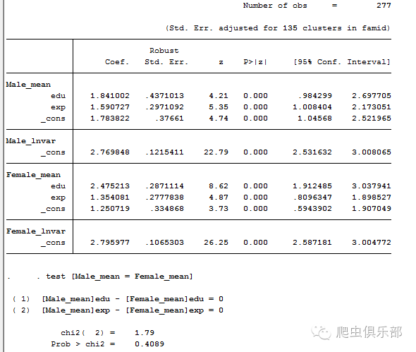 . suest Male Female ,vce(cluster famid) //vce 部分可加可不加,具体参见help。