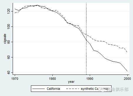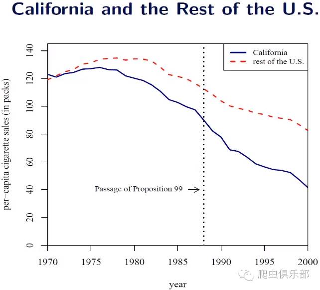 1989年美国加州实施控烟法(Proposition 99),提高烟草税(政策实施),为了评估该项政策的效果(我们很自然的想到使用DID,但由于找不到相似合适的控制组,见4中图1), Abadie et al.(2010, JASA)使用合成控制法研究该项政策对香烟销售的影响,以期评估该政策的效果。