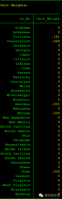 合成的控制组—“加州替身”:权重大于0的州只有五个,其他州权重均为0(见下图);需要说明的是:权重非负,且权重之和为1。