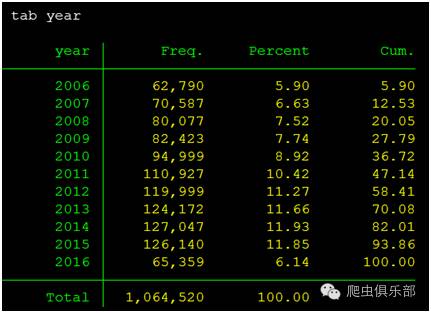 year太cool啦,不算重复的话,就11个,而且连续有规律,简直爽歪歪。柿子先挑软的捏,就先从year下手突破。year是从2006年到2016年循环,我们用forvalue循环,命令如下: