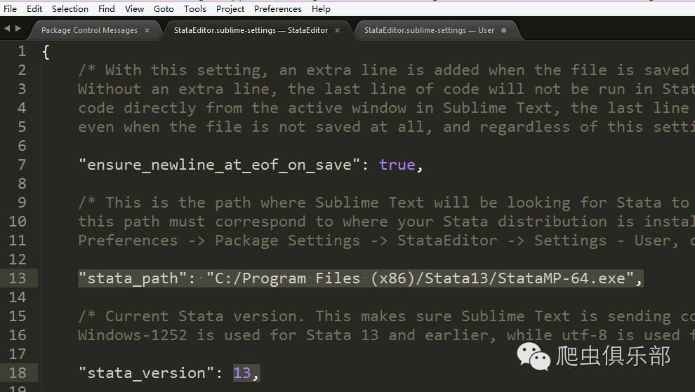 如果我们的stata安装路径是“C:/Program Files(x86)/Stata13/StataMP-64.exe”请跳过此步,否则,在Preferences>Package Settings>StataEditor>Settings>Default后(注意:不要修改Default中的内容),将所有文本复制粘贴到Preferences>PackageSettings>StataEditor>Settings>User,然后将本机Stata实际安装路径替换掉“C:/Program Files(x86)/Stata13/StataMP-64.exe”,并保存。注意路径是“/”而不是“\”。