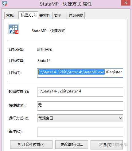 比如,笔者的stata14路径为“F:\Stata14-32bit\Stata14\StataMP.exe”,更改如下图所示: