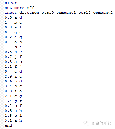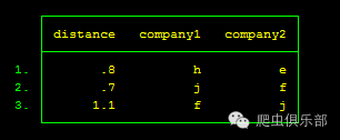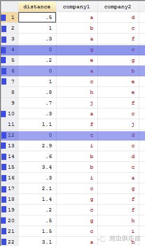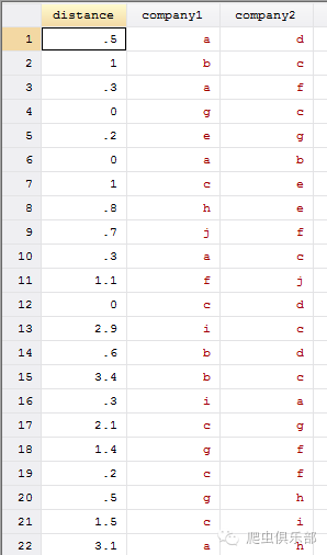 在这样一组数据中,distance指的是两家公司的距离,字符a-i分别指的是公司的名称。只要两家公司的distance=0时,我们就要将这company1与company2中出现的这两家公司名称的所在行进行删除,但并不只是删除distance=0的所在行。