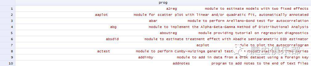 笔者从Stata网站上获取了2000多条Stata最近更新的命令及程序解释,单词之间以空格分隔。如下图所示(列示前10个观测值,总共有2512个观测值),分别是程序的名称跟描述,笔者想将其分成两列,一列是程序的名称,另一列是程序的描述,方便以后的更新与查阅处理。笔者曾经试图使用excel的分列功能,依据空格分列,但是这样做存在的一个问题就是它会将程序的描述语句也会分成相应的列,这样很不利于阅读跟处理。So,问题归结起来就是,对于大量的文字记录,如何在第一个空格处分列而在其他空格处不分列?