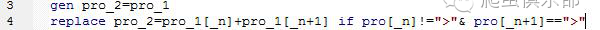 首先生成一个变量pro_2,然后当pro变量第n个不为>且第n+1个为>时将两个字符串相连,将92连到91后面(读者朋友可以自己思考一下,如果用n-1会怎样呢),结果如图所示,可以很明显看出,在第91条记录后面连接了第92条记录(i后面连接了mpro...),最后再将pro==>的记录删除即可。