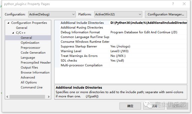 点击上方的view,选择property pages。在新弹出的窗口左侧,选中C/C++下方的General,点击Additional Include Directories右边的空白部分,选择edit,将Python.h文件所在的文件夹添加进去,笔者电脑上这个文件位于D:\Python36\include。点击确定。