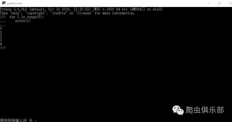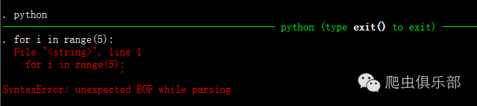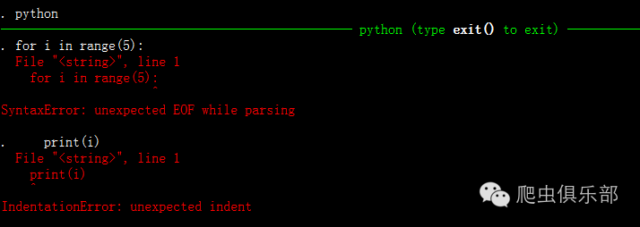 我们在命令窗口中输入for i in range(5):后再用ctrl加回车键切换到下一行,输入print(i)依然不行。