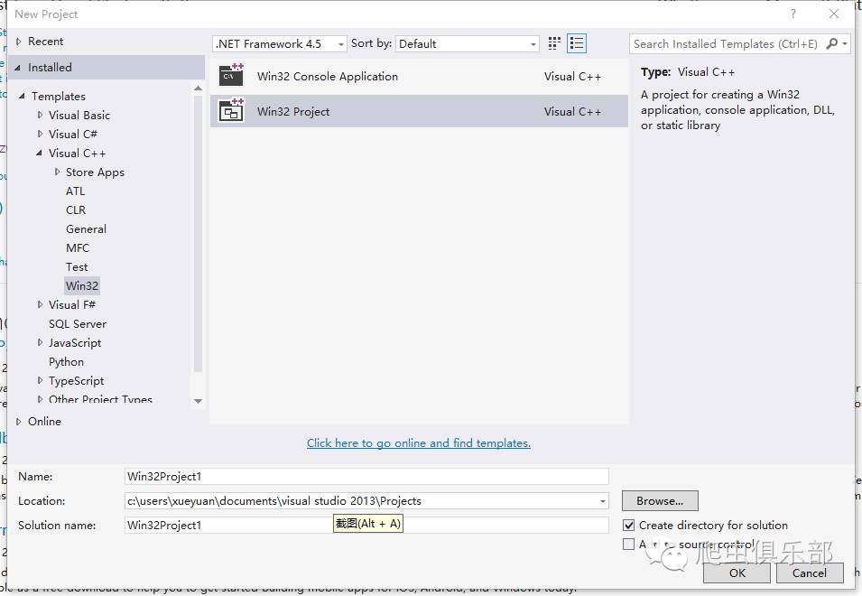 然后我们打开Microsoft Visual Studio,开始制作插件。这个命令的作者使用的是Microsoft Visual Studio2012,笔者电脑上安装的是Microsoft Visual Studio2013,基本没什么区别。如果你的电脑上安装的是中文版的,请找到对应的内容。首先点击file,new,project在弹出的窗口中,左侧的模块下面点击Visual C++下的win32,在中间选择win32项目,点击ok。