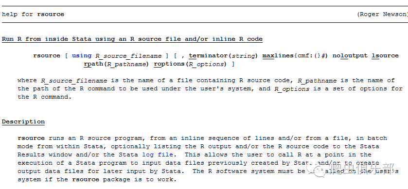 在Stata中,有许多命令可以使我们在Stata界面内去调用其他软件的命令或者数据,增加了与其他软件的联系。比如在Stata中有rsource和rcall这些命令,可以帮助我们实现Stata与R的互动。