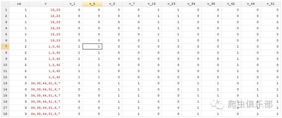 有这样一组数据,变量v里面包含了很多用逗号间隔的数字,如果想统计一下每个数字是否包含在这个变量里,并用一个0,1变量表示出来,比如:v_1=1表示变量v中出现了1,v_16=0表示变量v中没有16。