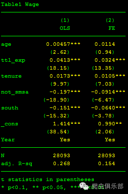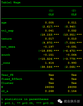 esttab m1 m2, star(* 0.1 ** 0.05 *** 0.01) staraux b(%6.3f) t(%6.3f) compress nogap drop(yd*) stats(Year_FE Fixed_Effect Cluster N r2_a, fmt(%3s %3s %3s %12.0f %9.3f)) varwidth(20) title("Table1 Wage") mtitle("OLS" "OLS" "FE")