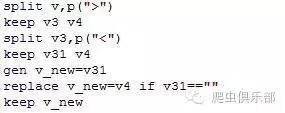 通过观察,可以先以“>”对字符串进行分列,将变量v分为v1-v6,我们需要的是v3,v4;然后可以对v3再以“<”分列,分成v31跟v32,对v31的空值以v4的相应字符串填充,代码如下:
