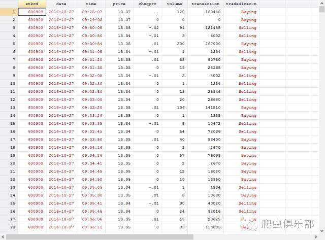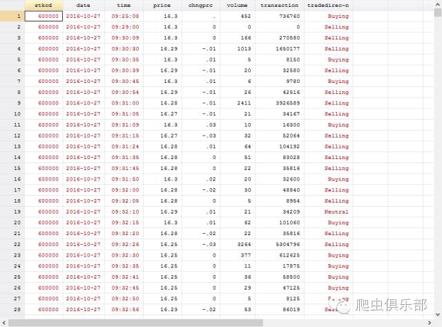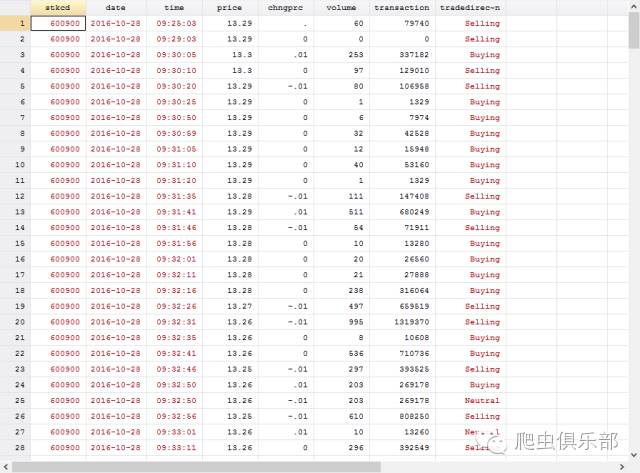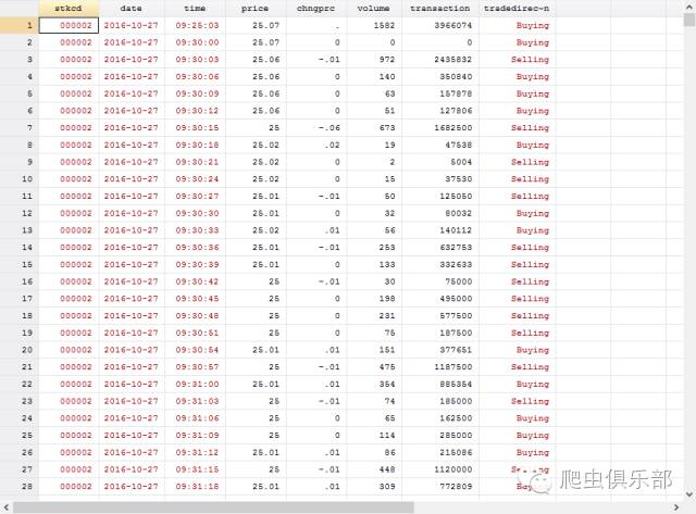 样,我们就下载到了当天万科每三秒更新一次的分笔交易数据。我们获得的信息包括股票代码、日期、时间、交易价格、价格变动、交易量(手数)、交易额、交易