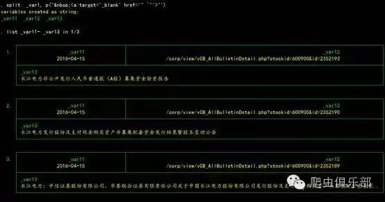 如果这时候我们用“</a><br>”作为分隔符,可以将上面的长长字符串分割为30段,代表30条公告信息,对应的命令是: