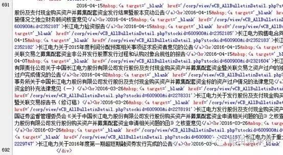 进一步的工作就是将长江电力的31个网页抓取整合起来,或者进一步将所有上市公司的网页全部抓取下来,这需要两层循环而已,读者可以自己去琢磨。