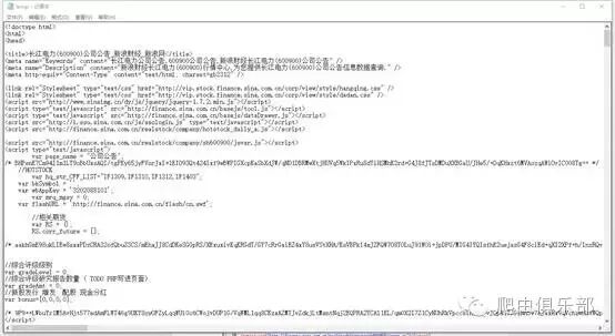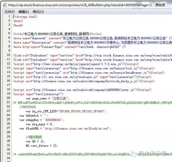 现在就将长江电力的第一页公告保存到d:/temp.txt了。打开看看吧,不是网页,而是网页的源代码: