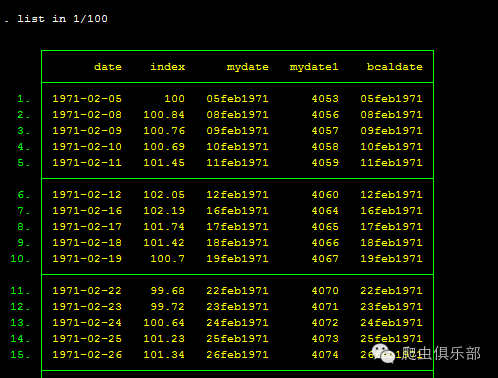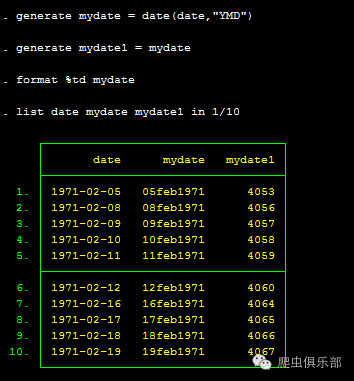 我们可以通过use重新调用一份数据http://www.stata.com/data/nasdaq,首先通过date函数,将date列的数据转化为Stata 数值型日期,并保存在mydate和mydate1中,并且将mydate的数据显示格式变为%td格式,具体命令下:
