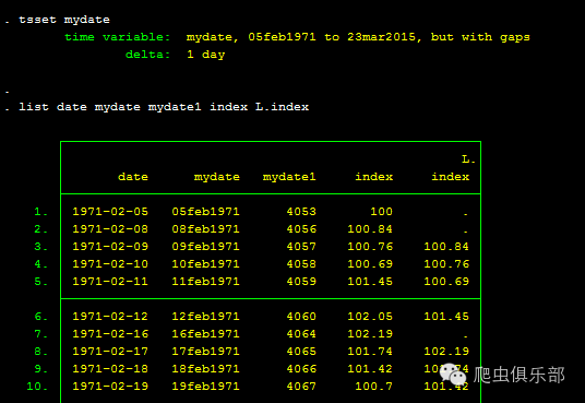 对mydate使用tsset命令并且显示变量index及其滞后一期的数据,具体命如下: