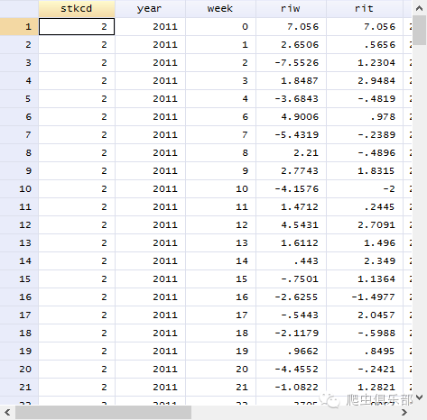 个股每年每周市场收益率也轻松搞定~ 我们可以发现个股收益率和市场收益率有相同的year、weak变量,为了便于收益率的回归分析,我们可以通过year、weak将个股收益率和市场收益率横向合并为一个文件,这个工作只需再加一个merge命令: