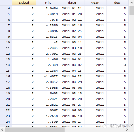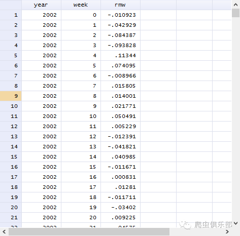 所 得数据中,我们只需要日期和收益率两个指标。并且为了同步性的计算工作,我们需要将日数据转化为周数据。而将一周内多个交易日的收益率相加得到的收益率往 往因为会受到周末效应的影响而饱受诟病,因此我们要将自然周转化为非自然周。比如用周三收盘到下一个周三收盘的日收益率累积计算周收益率。命令程序如下: