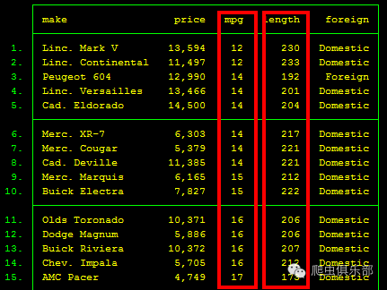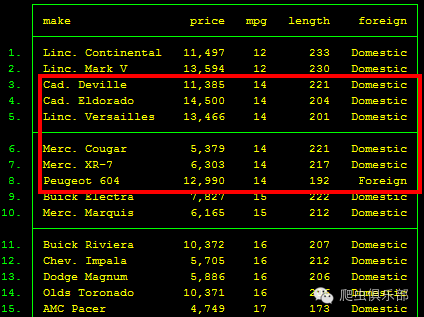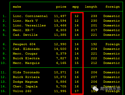 一眼看去,结果好像并没有发生什么变化,可真的是这样吗?我们以结果中mpg值同为14的部分数据为例,除了mpg值的相同让它们的排序发生了变化之外,其他排序与图一中的排序保持一致,再与图二的结果对比一下,你发现这个小差别了吗~