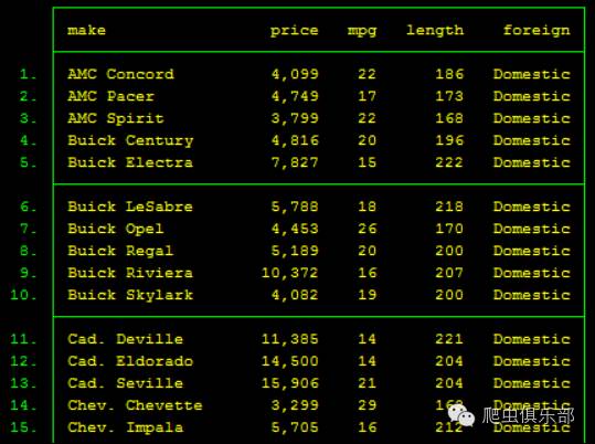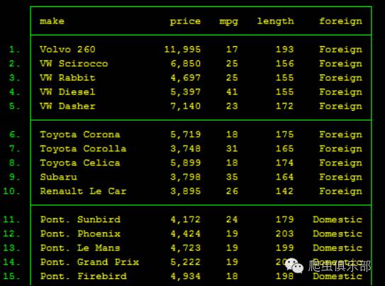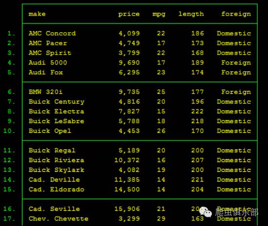 为了方便我们的演示,我们对数据进行截取,在系统数据中,只保留make、price、mpg、length、foreign几个变量。