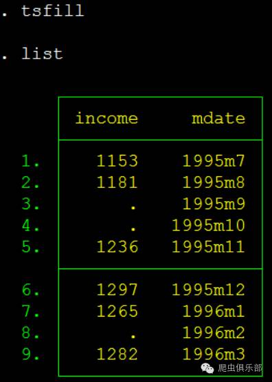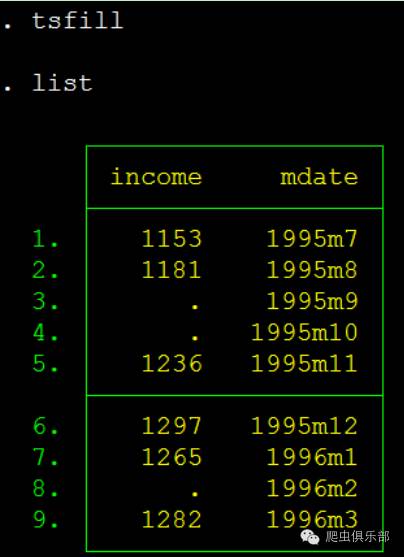 时间变量mdate已经被填充完毕,从1995年7月到1996年3月,时间间隔仍为一个月。