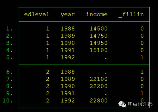 此时,我们就拥有了完整的数据集,并且注意,数据集中生成了一个新的变量_fillin,如果数据新补齐的,则_fillin为1;数据原本存在,_fillin为0。