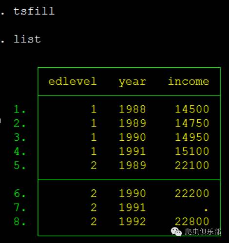 tsfill命令的作用也是补齐数据,但不同于fillin,tsfill只能补齐时间变量的数据。