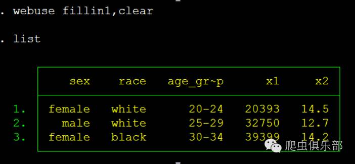 从 list的结果可知,目前数据集里包含有20-24岁的白人女性,25-29岁的白人男性,30-34岁的黑人女性。但是在实际研究中,如果使用该数据集 研究问题,那么结论一定会产生偏差,因为我们的抽样不合理。我们需要的是各年龄段、不同肤色、不同性别的样本数据,也就是说我们的样本数据应该有12个才 合理。fillin命令就可以很容易的将缺失数据补齐。