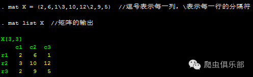 mat X = (2,6,1\3,10,12\2,9,5) //逗号表示每一列,\表示每一行的分隔符