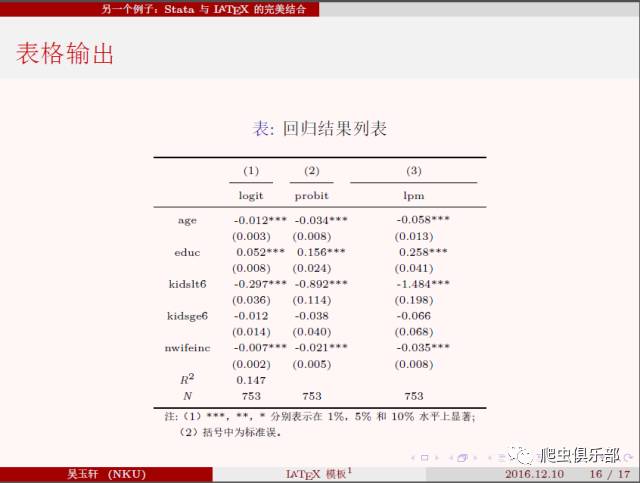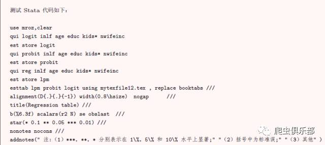 分别利用logit,probit,lpm方法估计三个模型,并进行保存,会生成一份*.tex的文件(例子中是用的mytexfile12作为文件名)。