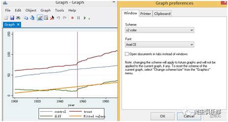 line control year,lwidth( medthick)yaxis(1) xline(1955) xaxis(1) lwidth(medium) || line treat year ,lwidth(medthick)||line diff year,lwidth( medthick)||lfit diff year,lwidth( medthick)