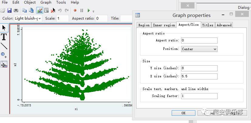 scatter x2 x1 ,color(green) jitter(2) ylabel(minmax) xlabel(minmax)