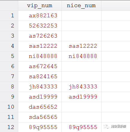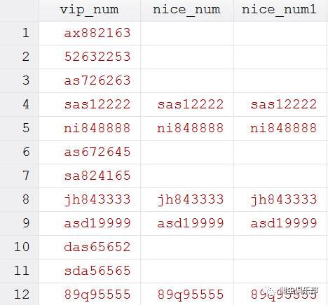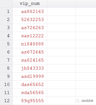 边列出了12个vip卡号,其中第4、5、8、9、12行为靓号,当然12个卡号我们通过眼睛搜索就可以查找出来,但是一个公司的vip卡可能成千上万