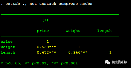 3) esttab命令中的unstack选项可以使输出的结果变为我们常见的下三角矩阵的相关系数表输出形式。